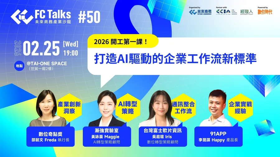 由《未來商務》深度經營企業具決策或影響力的商業創新社群。AI時代下產業轉型需求飆速也倍增,FC Talks瞄準企業關鍵痛點,與創新行動者交流關鍵解方,對接創新資源、促成新商業機會。