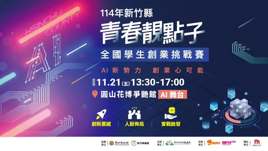 114 年新竹縣政府青春靚點子全國學生創業挑戰,經過數月激烈的競爭與高強度的訓練營洗禮,最頂尖的創業團隊即將登上亞洲最具影響力的 AI舞台—Meet Taipei 創業嘉年華,進行最終的王者對決!
