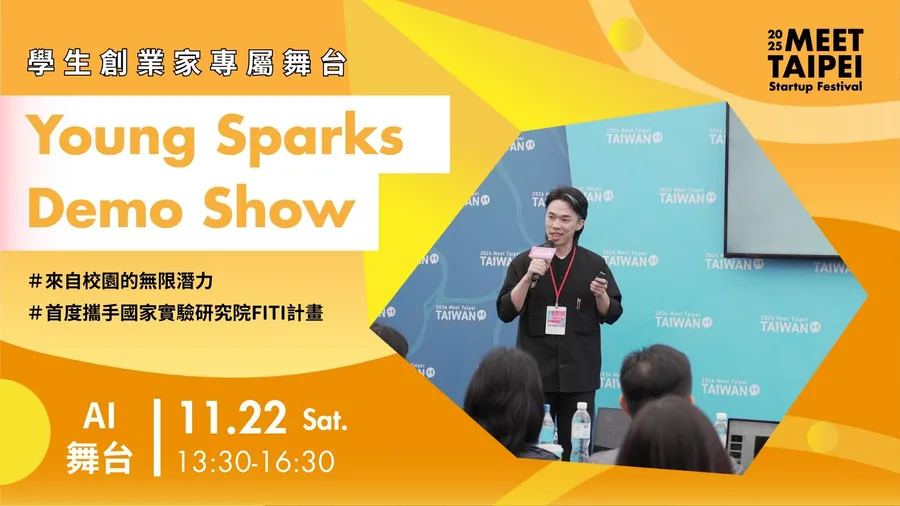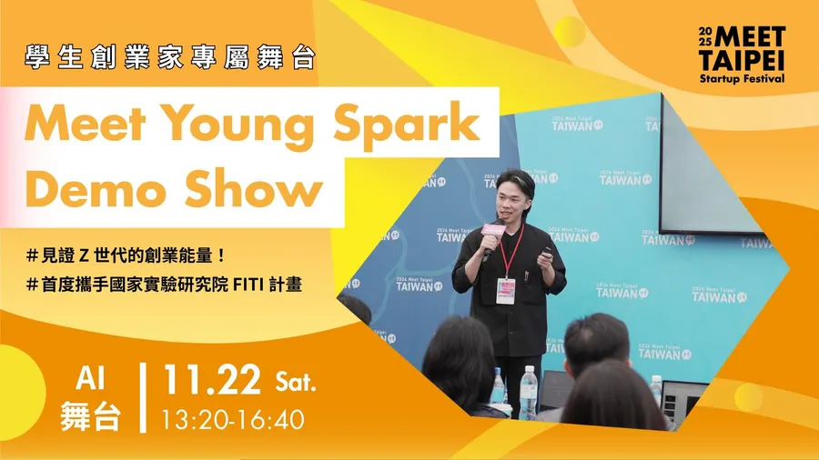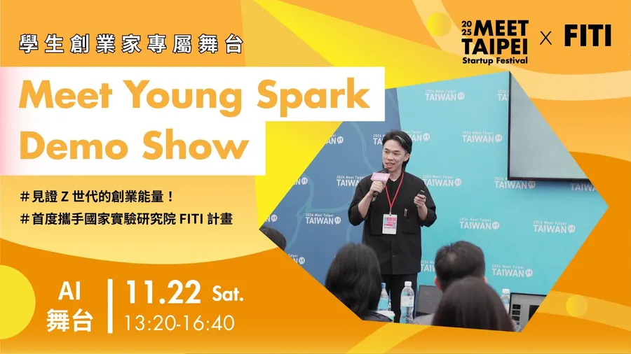 Meet Taipei 首度攜手國家實驗研究院FITI計畫,募集來自校園、具備獨特創業構想的潛力新創團隊,透過書審、線上初選,最終評選出 11 組最具潛力的團隊進駐展區,並參與 Meet Young Spark Demo Show。這不僅是一個讓學生新創團隊展示創意成果的舞台,更是一個讓校園創新與社會生態接軌的開放場域,串聯校內育成機構、政府激勵方案、企業支持單位與青年創業資源,為年輕創業者打造一條從校園走向產業的完整路徑。