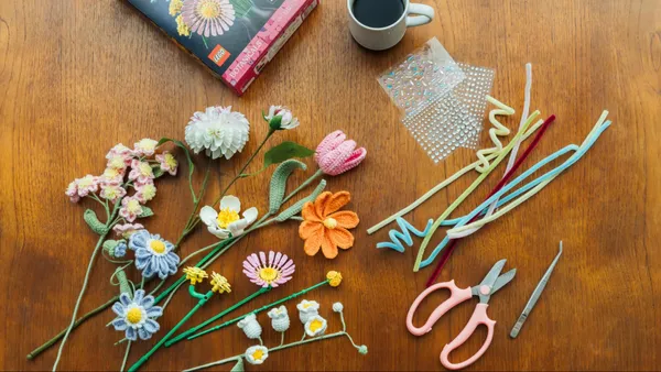 ◦ 跨材質混搭包:提供擬真花及鉤針花總計 4 枝、繽紛毛根、鑽飾等手作配件。